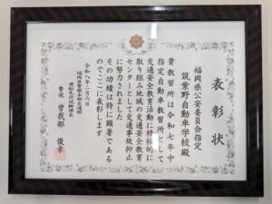 福岡県指定自動車学校協会より、交通安全教育センターとして初心運転者の教育をはじめ地域の交通安全思想の普及に尽力した功績により頂きました。