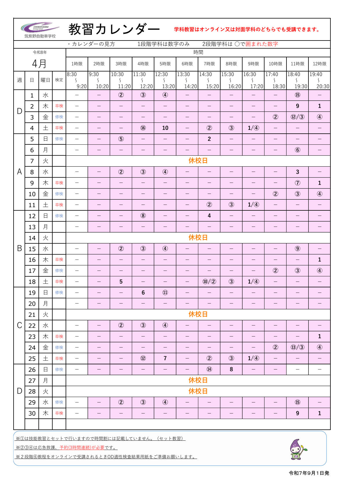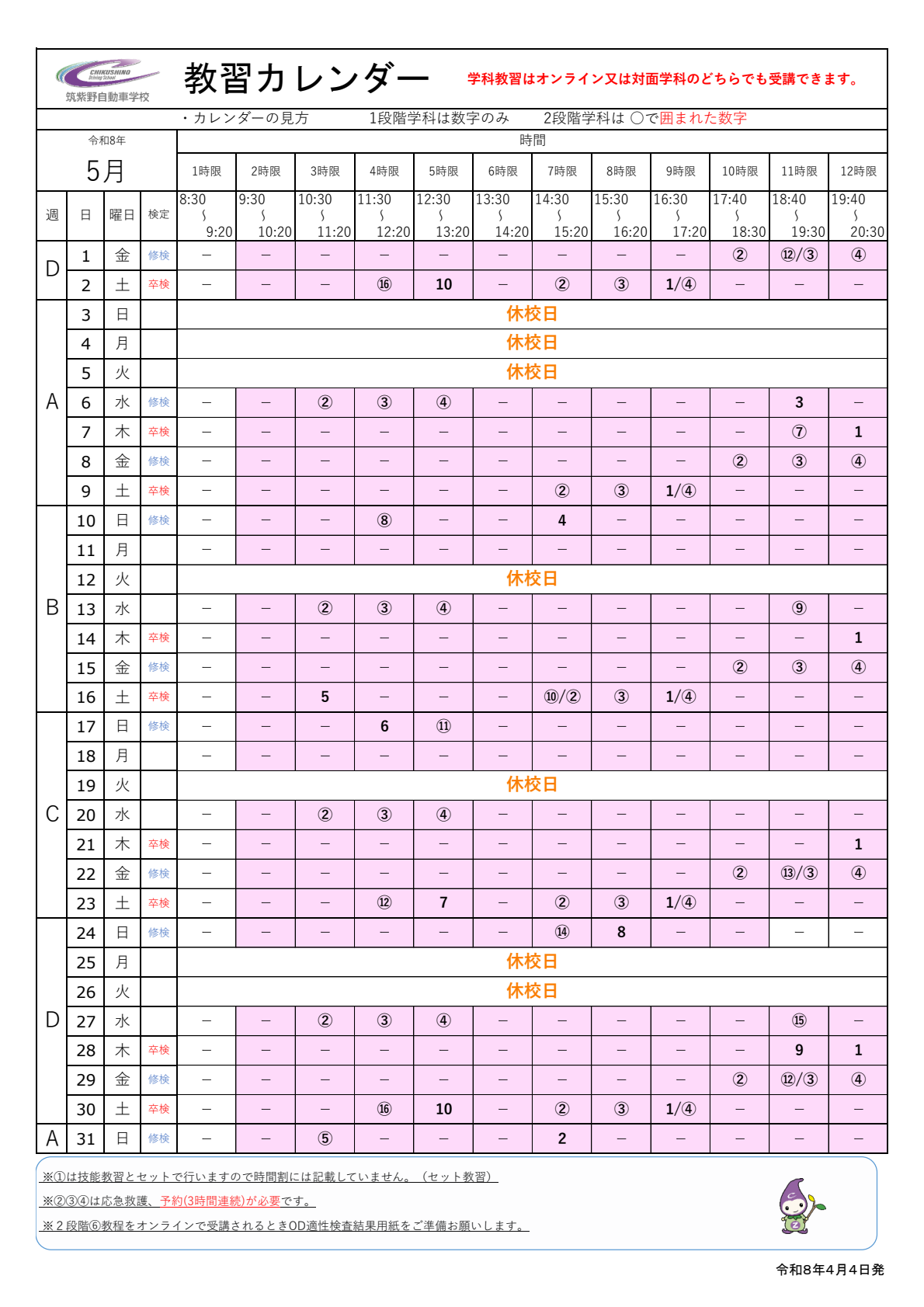 4月教習カレンダー